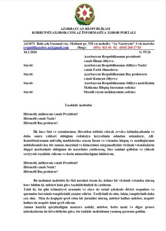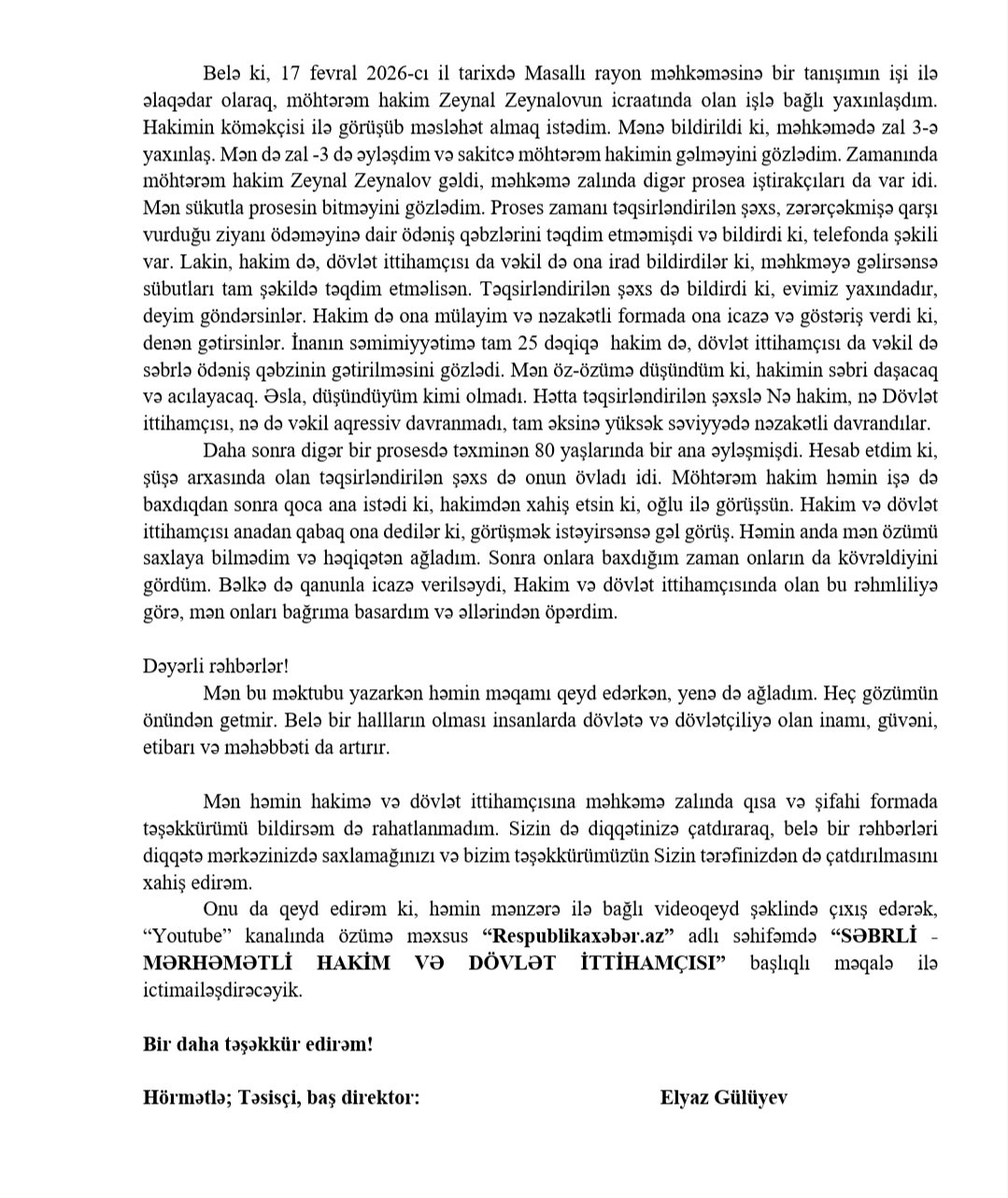 "KORRUPSİYAXƏBƏR" xəbər verir ki, redaksiya heyyətinin rəhbəri Elyaz Yazan, bu gün Masallı rayon məhkəməsinin hakimi cənab Zeynal Zeynalovun və dövlət ittihamçısının barəsində AR-nın prezidenti cənab İlham Əliyevə, AR-nın Ədliyyə naziri cənab Fərid Əhmədova, AR-nın baş prokuroru cənab Kamran Əliyevə, Məhkəmə Hüquq Şurasının sədrinə və Masallı rayon məhkəməsinin sədrinə təşəkkür məktubu ünvanlayıb.
