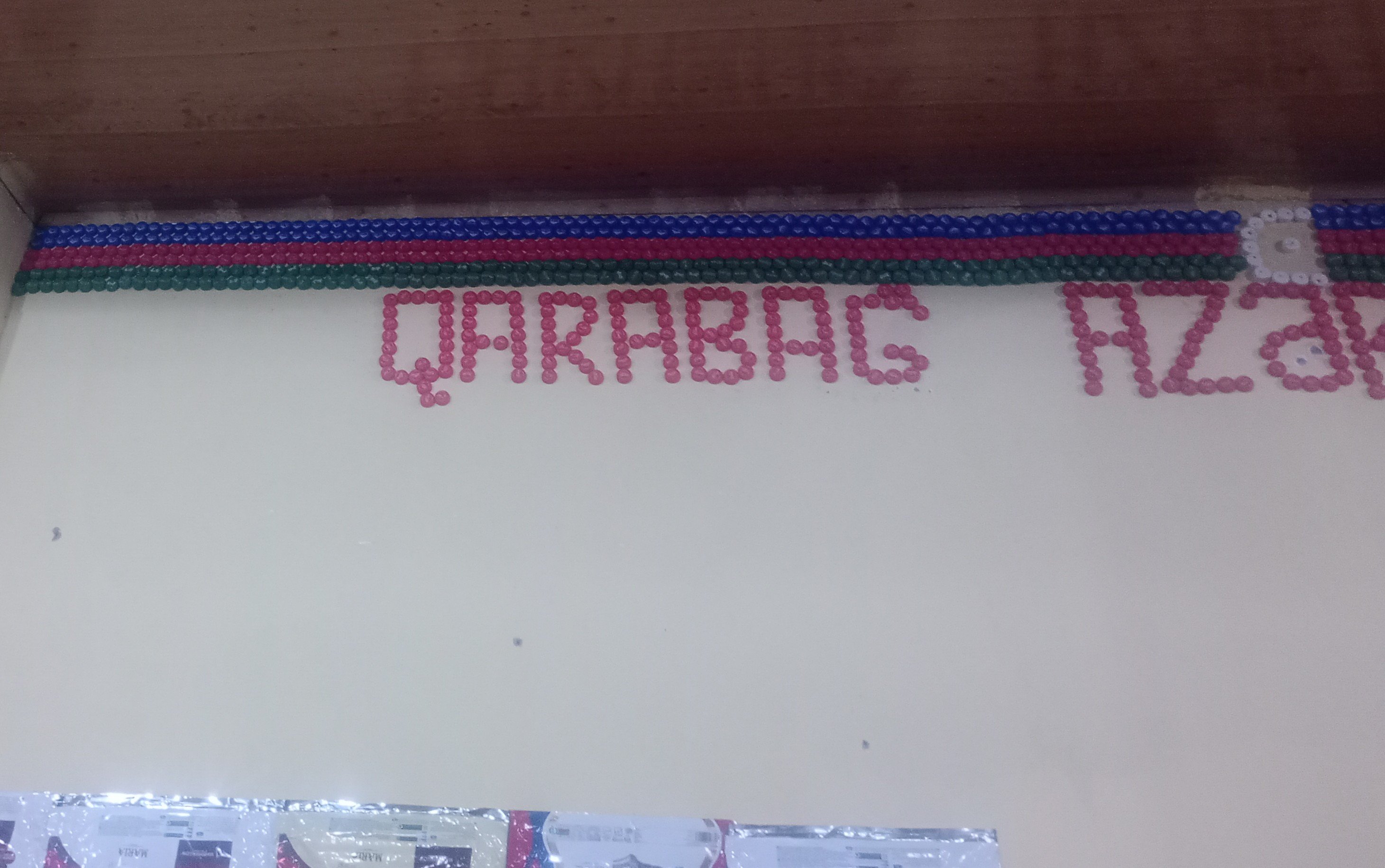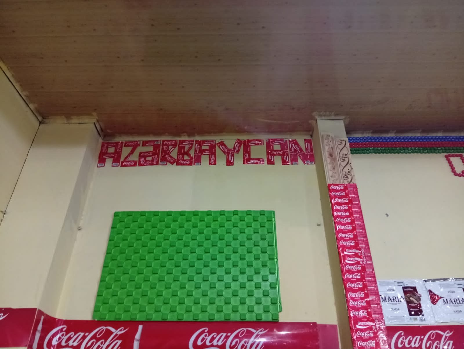 Gördüyünüz bu fotoşəkil, Elyaz Yazanın işlətdiyi ictimai iaşə obyektinin daxili divarındandır. O, sərinləşdirici spirtsiz içkilərin (cogo gola, fanta və sirab kimi sərinləşdirici içkilərin) üz kağızından və qapaqlarını bir-bir xırda mismarlarla divara sancmaqla, "AZƏRBAYCAN", "QARABAĞ AZƏRBAYCANDIR" və eləcə də Azərbaycanımızın bayrağını əks etdirən bir formça yaratmışdır. həmin obyektə müştəri qismində gələn şəxslər də Elyaz Yazanın bu kimi hərəkətlərini yüksək qiymətləndiriblər.
